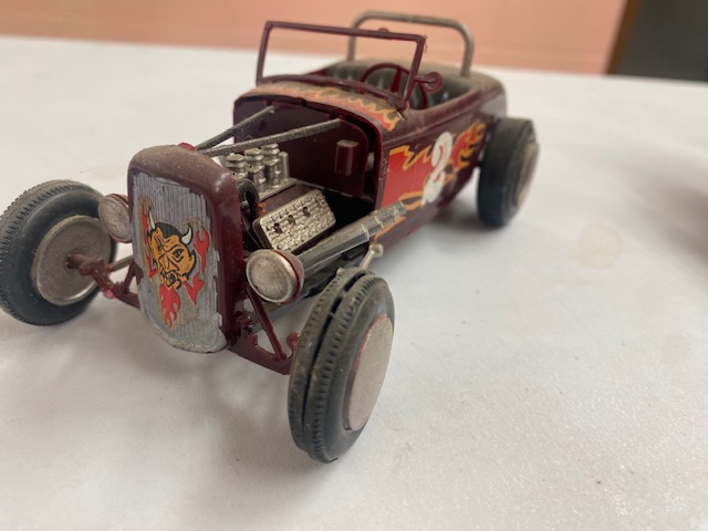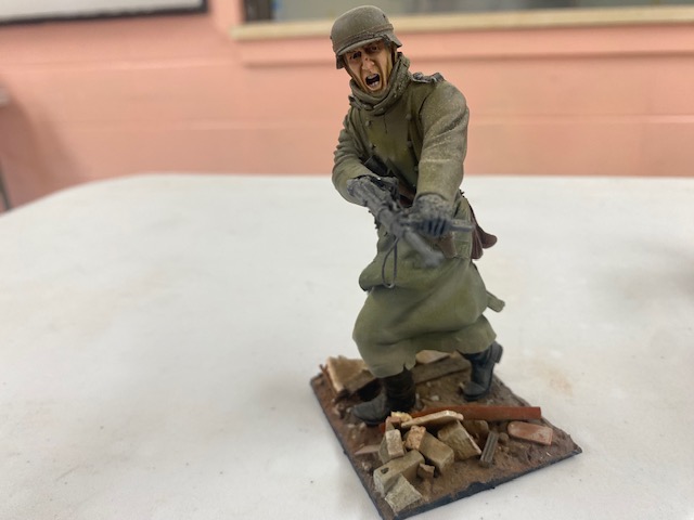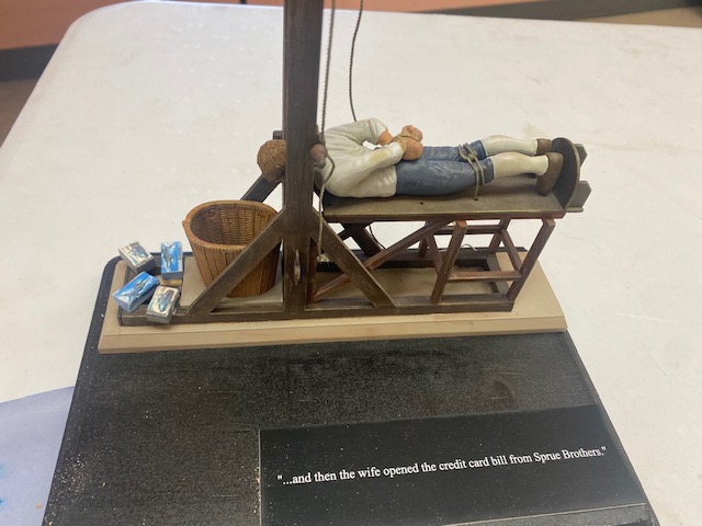 The April meeting went very well. We were a bit shy on member attendance due to many having holiday commitments with family and friends. Those who attended were able to take a delicious bite of our anniversary cake sharply cut by little Rob! Good cutting Rob! The humor theme of the month brought out two candidates, with the guillotine vignette competing with a super neat “funny” car crafted by Andre. The guillotine vignette won by 1 vote! It is interesting to note the theme winner for March was tied at first before Pat won; this short trend tells me we are all equally talented! Todd gave a superb second parter of his lecture on creating custom molds and parts. Todd is a natural in teaching and I hope he volunteers for more lectures.