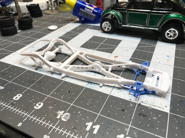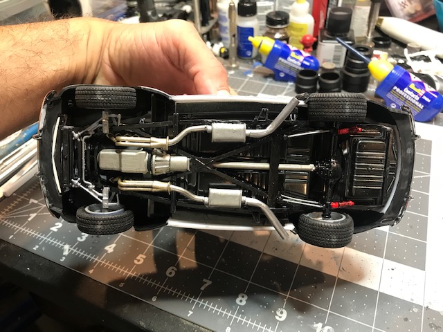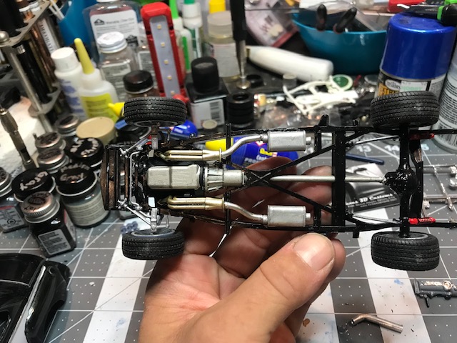 Here you can see the rear seat delete done in sheet styrene, front seats are Porsche 911. Finally the exhaust made with resin mufflers and solder, held together with E6000 glue.