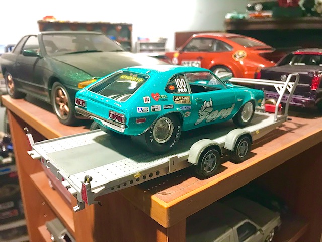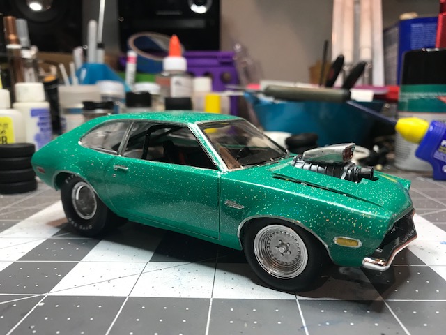 The interior tub of the Vega fit perfectly inside the Pinto body, requiring only minor surgery on the rear glass. The engine is a resin supercharged Hemi from my spares. Color is Testors lacquer “Grabber Green” overlaid with Testors iridescent shimmer (glitter paint). I did a little back dating of the Pinto using the Vega bumpers, front and rear.