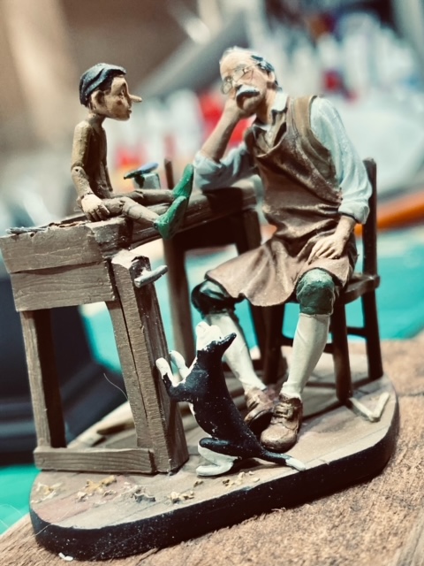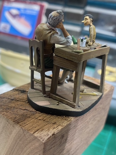 Gents. Here is the finished Gepetto scene.  The he figure set is from Andrea Miniatures 54mm metal figure set.  Acrylics were used for the figures but lacquers were used for the flooring and the work table.  I used a block of walnut wood from the garage for its “woodshop” look.
