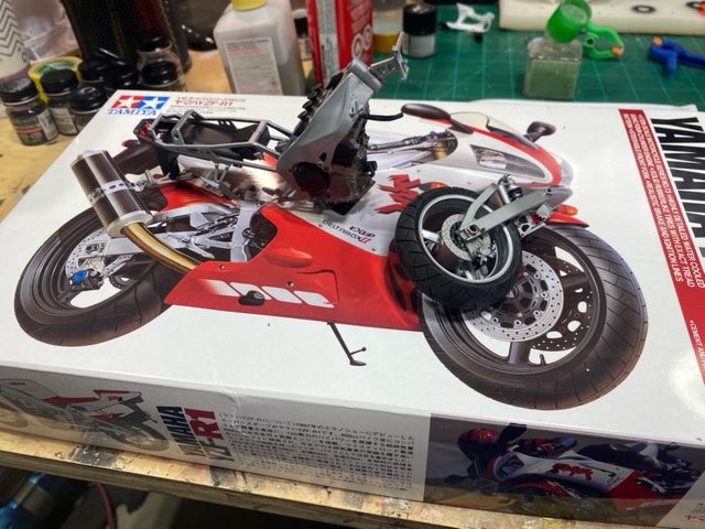 Well I know what route I would take but this isn’t my build so. I would however respectfully suggest that a color shifting paint job would be very cool on an R1. Testors offers a few variations on the theme, my personal favorite is the green\gold. I like to use a trio of aluminum, steel, and Tamiya Titanium silver on bike frame\drivetrain builds as it keeps everything from becoming a big silver lump. The intake trumpets on your R1 would look lovely in Tamiya Titanium gold, would really make the top half of your engine pop. Its coming together nicely so far Chris. I’m looking forward to seeing the aforementioned killer babe.