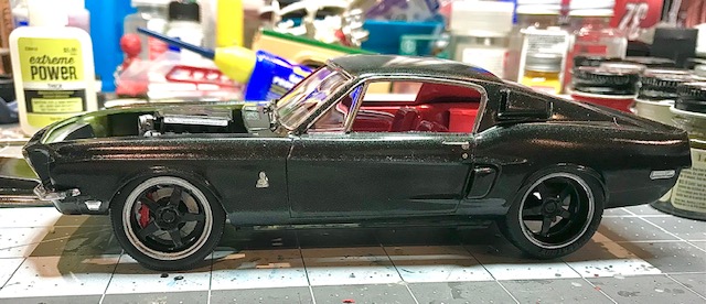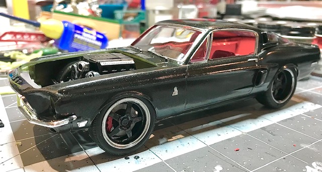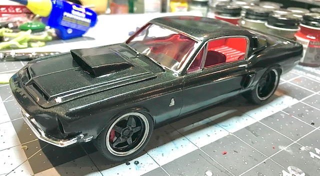 Progress is being made on the Shelby. Paint came out fantastic. Base coat is flat black, followed by Testors Blazing Black lacquer. Interior is three shades of red. I ended up removing a fair bit of the front crossmember to lower the engine enough for the hood to clear. Even with all that I still needed a 60s Mopar “mailbox” hood scoop.