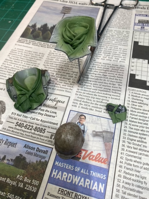 Hey gents. Here is a start of a bust of Captain Dick Winters of Easy Company. I am doing this on reverse, in that I will paint his jacket last and doing the relief work first (straps and stuff). I dabbed a light layer of Ammo non-slip on the helmet to give it that rough steel texture. Will let it dry a full day before priming it and eventually painting it. The pistol holster and the more green looking straps were AK lacquer airbrushed color but the off-green and browns are AV Vallejo acrylics brush painted. The jacket will be AV Vallejo as well and brushed on.