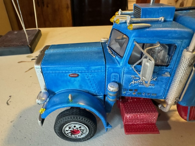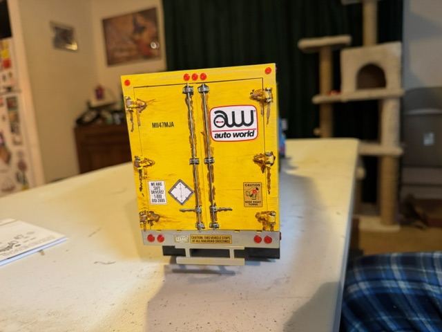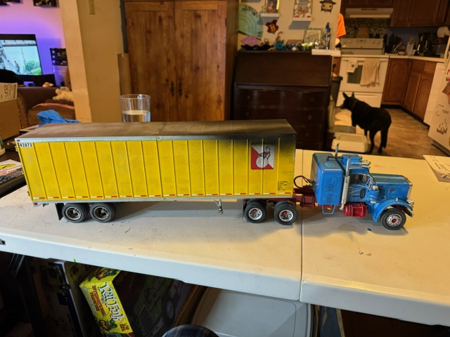 Anyway, I used Tamiya acrylics for all the colors and ACE house brand MATTE clear. Just so happens the clear reacted with the Tamiya and actually improved my beat up, faded look. This was my first real attempt at weathering and other than the rear of the trailer, I think it turned out well. This is headed to the NOVA show, so we’ll see how it does.