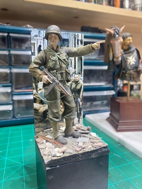 Hi gents. Finished my Hospitaller Knight with horse bust, a 75mm Captain Miller figure on a plinth (fancy word for base) that has a vertical rise in the back-perfect to add a backdrop. Here you can see the effect. The cobble street was a piece cut from a base I got from Randy and the debris is from Diodump.