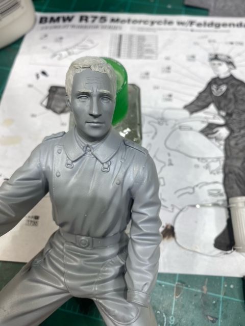 Everyone at the last meeting saw Scots then in-progress build of the 1:9 scale German field motorcycle. Scot has now finished the bike and now it’s my turn to complete the figure and his “kit” (term for gear).
