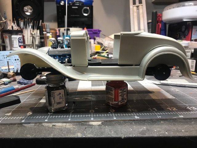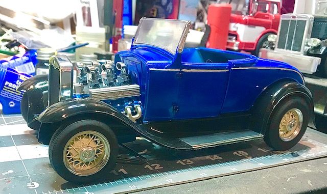 Body and fenders in paint, body fit to chassis has been finalized. Trying out a pinstripe that matches the wheels, which I really like. Just haven’t decided on whether I need more pinstriping yet. Still have the interior paint work to get done, then it’s on to details and final assembly.