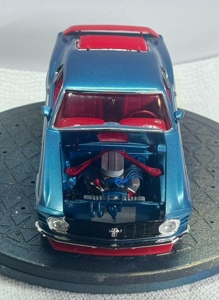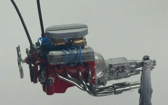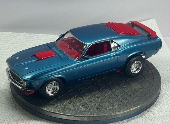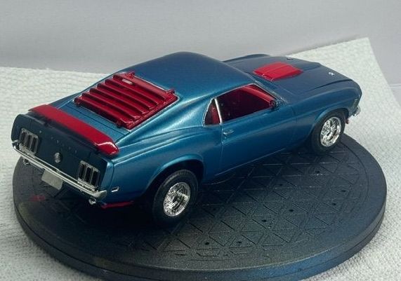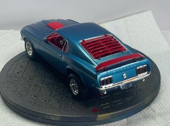 Well,  build number 35 for the year is in the books. 1970 Mustang with a fuel quad 427 from Texas 3d customs. I really do like his stuff. Very well detailed. I wired and plumbed it. Made the headers out of solder, small piece of aluminum tubing and some shrink wrap. Wheels and tires are from a 2n1 1970 Buick GSX. Not your typical paint scheme, but I like it.