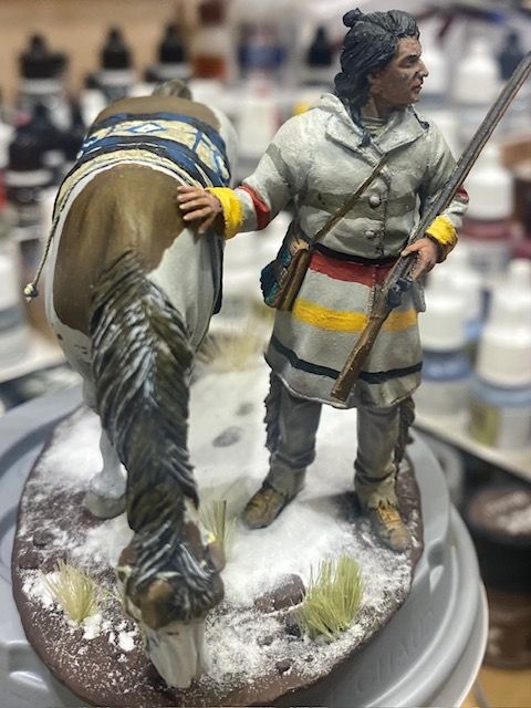 Hey gents. Just about finished with a 54mm (1/35 equivalent) Indian figure with horse. I have to finish the figure’s head feather and highlight the horse’s saddle-blanket. The base came with the kit but I added the grass and snow. Acrylics were the paint medium for most of the project but the white base of the horse was done with lacquer.