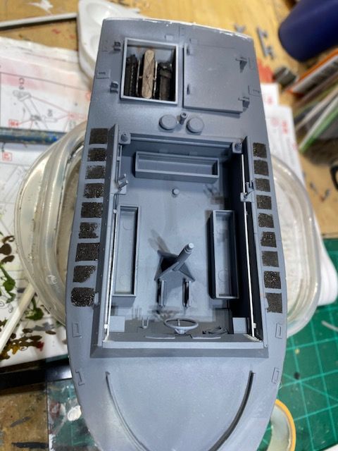 I added the handle bars inside the boat’s bay and added non skid to the port/starboard skirts. As this was a tactical boat used in Vietnam it will be green overall instead of Navy grey. Should take another 3 or so weeks to finish up the boat itself. The plan is to make a scene of it being dockside and under light maintenance.