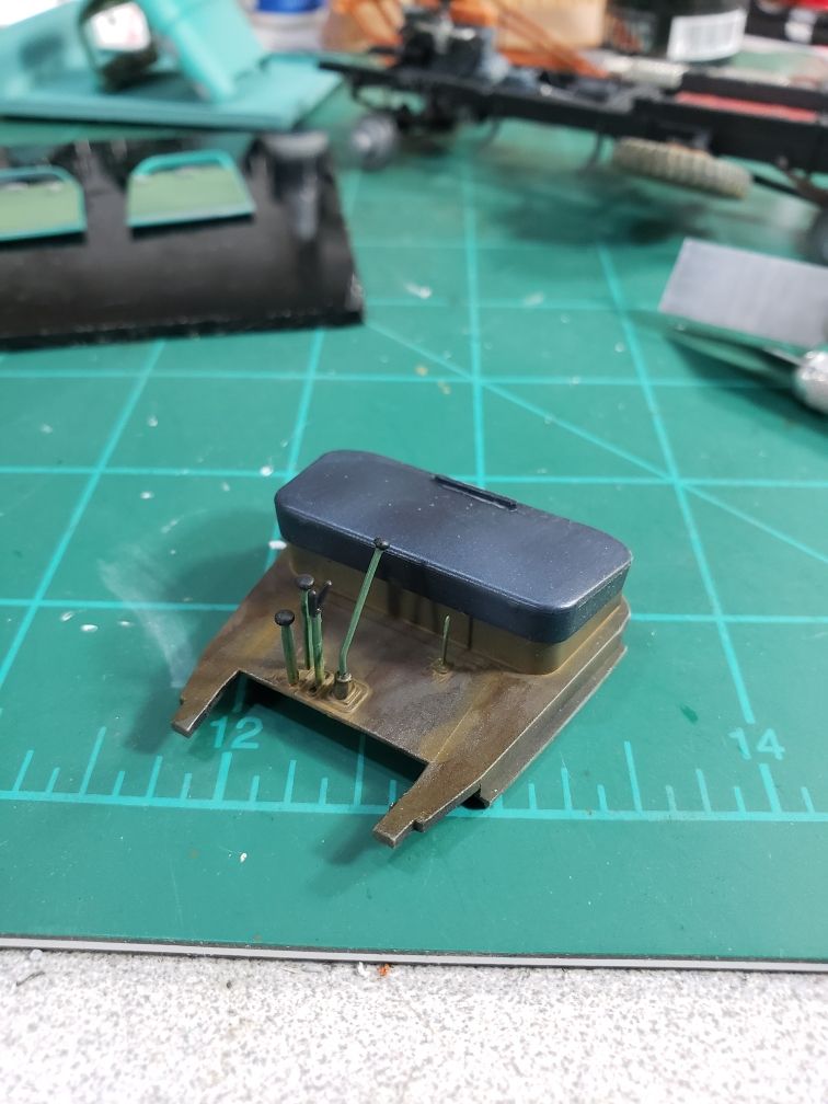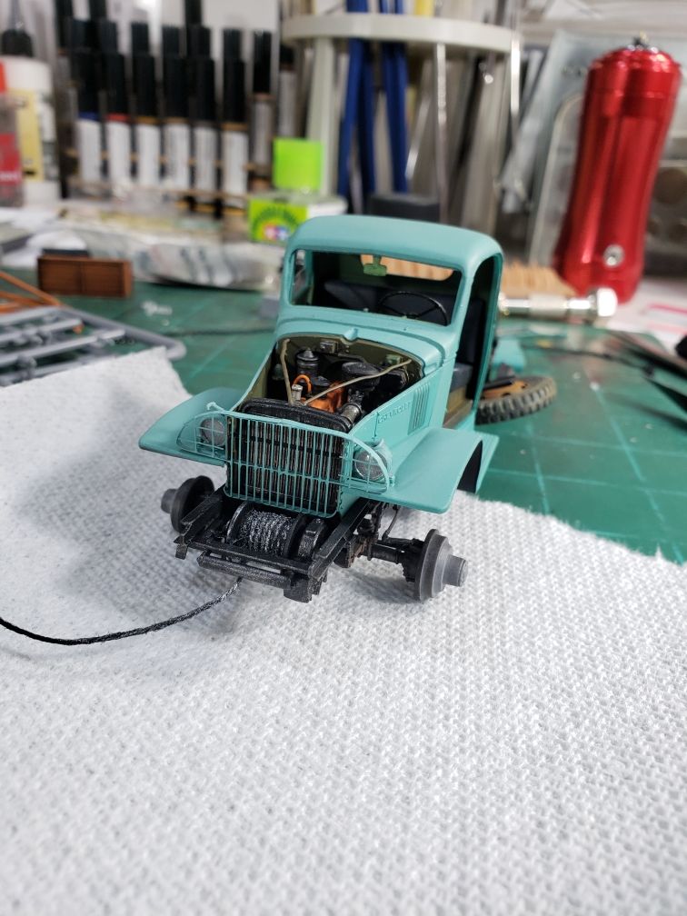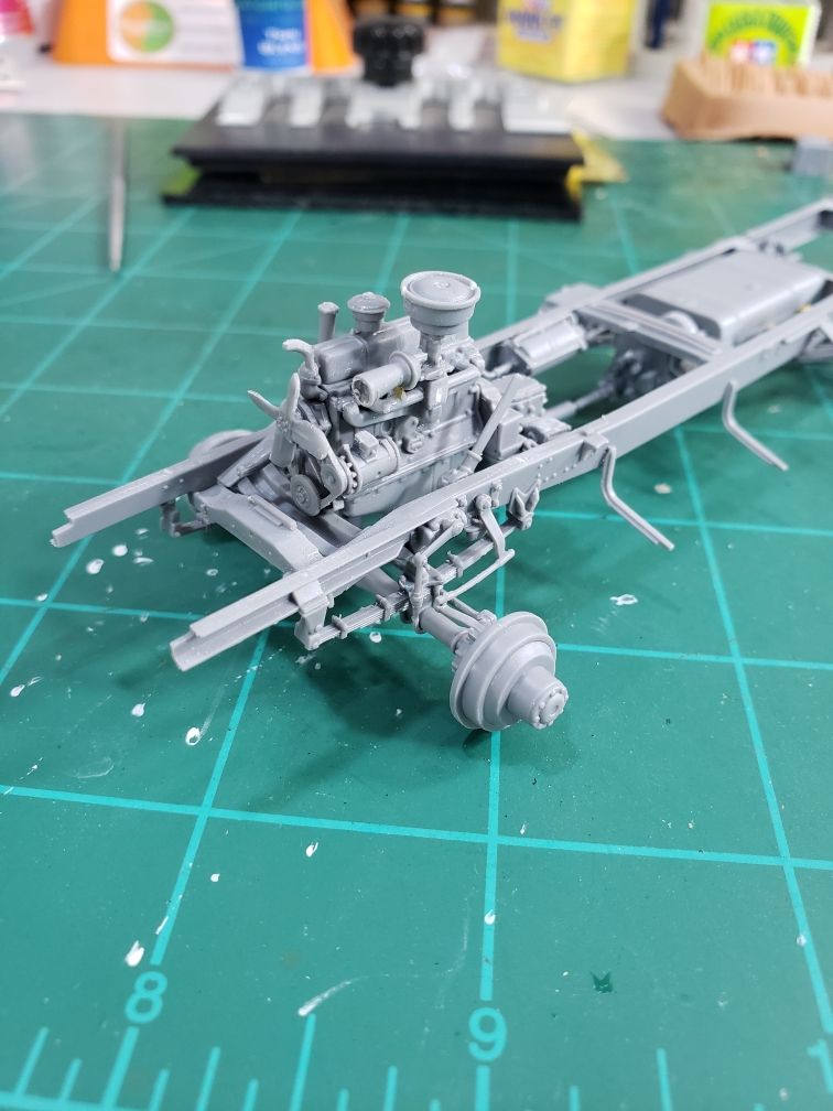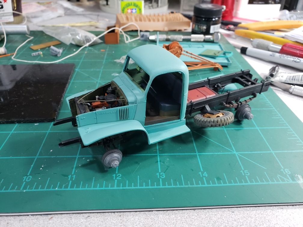 The chassis completed.The cab interior. The cab interior. Cab on chassis.Cab on chassis.Engine with wench cable. I used twine to simulate the rope.Finished kit.I added a tool box set that is also made by Miniart.A pic with all the awards I have won with it.