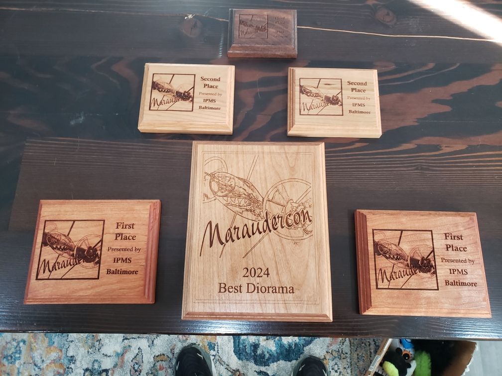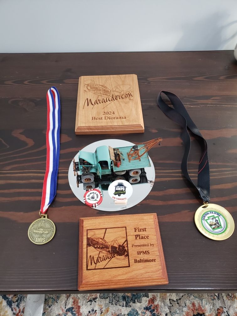 Here are my trophies from Maraudercon. I got 1st place for my WW1 dio, and the tow truck. I also got best diorama (only because Scott was not there). I got 2, 2nd place trophies for my dino head, and my Kozak-2 armored car. I took 3rd place with my rocket panther. I also won these items at the raffle. It was a very successful show for me.