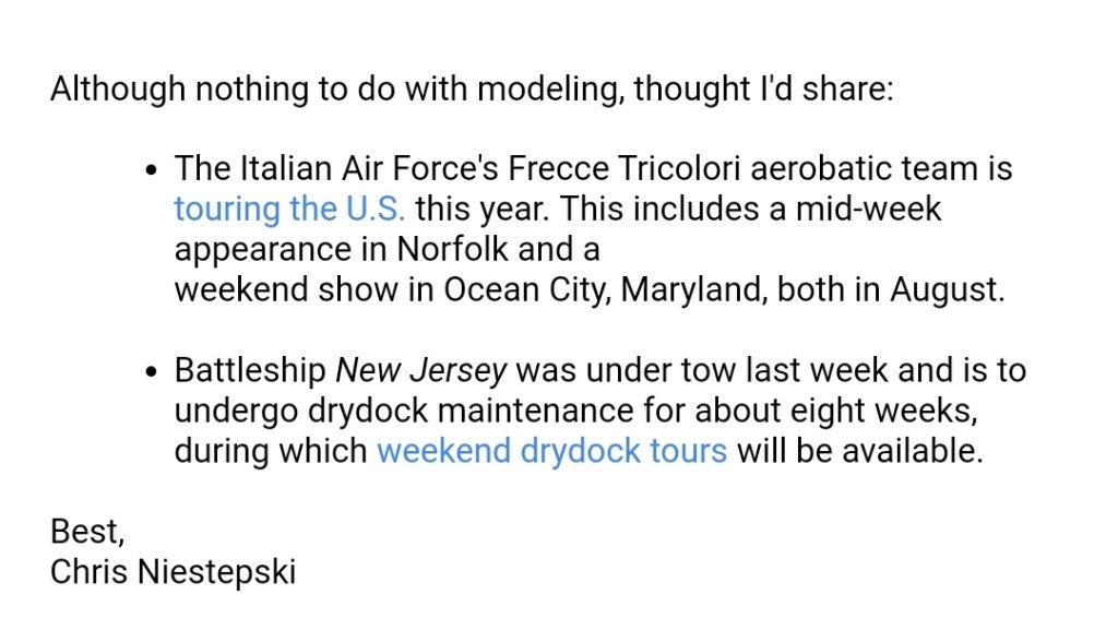 Personally, I REALLY want to see the Tricolori team. I’ve seen the Blue Angels, the Thunderbirds, and the Red Arrows, and every one of them has been a blast. The battleship tour isn’t as big of a deal to me but it would still be pretty enjoyable I suspect and I’d absolutely be down to tag along with someone else.