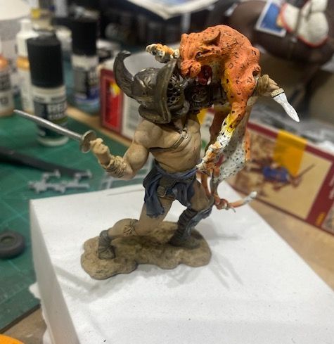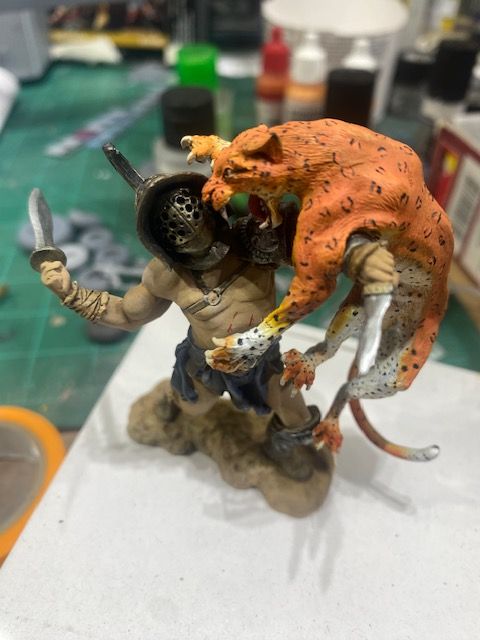 Gents. Here is a 75mm gladiator and leopard locked in lethal combat! The kit is from Scale 75. The gladiator’s skin was airbrushed on with a light highlight layer applied via airbrush. The rest of the skin tones were applied via brush. The gladiator’s clothing was brushed on using acrylics. The fierce cat had its base coat applied via airbrush, with 4 different colors applied. The spots were applied using a 0000 brush using black and brick orange.