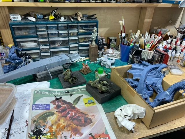 Are you building??!! Here is a shot of my desk. There are 2 German soldiers and their bases about to be finished; a German POW bust that just needs a metal name placard to top it off; a dragon and its female warrior master; a mythical prophet of doom on his horse; and the “now-I-see-Randy is evil” for giving me the GIANT CH-54 helo to have ready by 2025 Nats (I swear I will get even with that guy!).